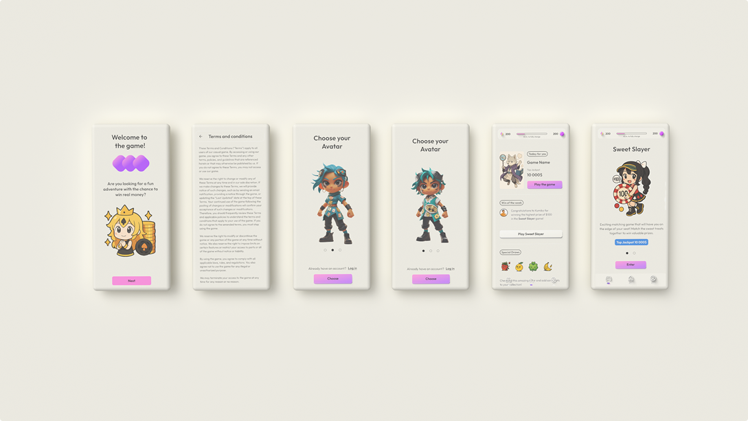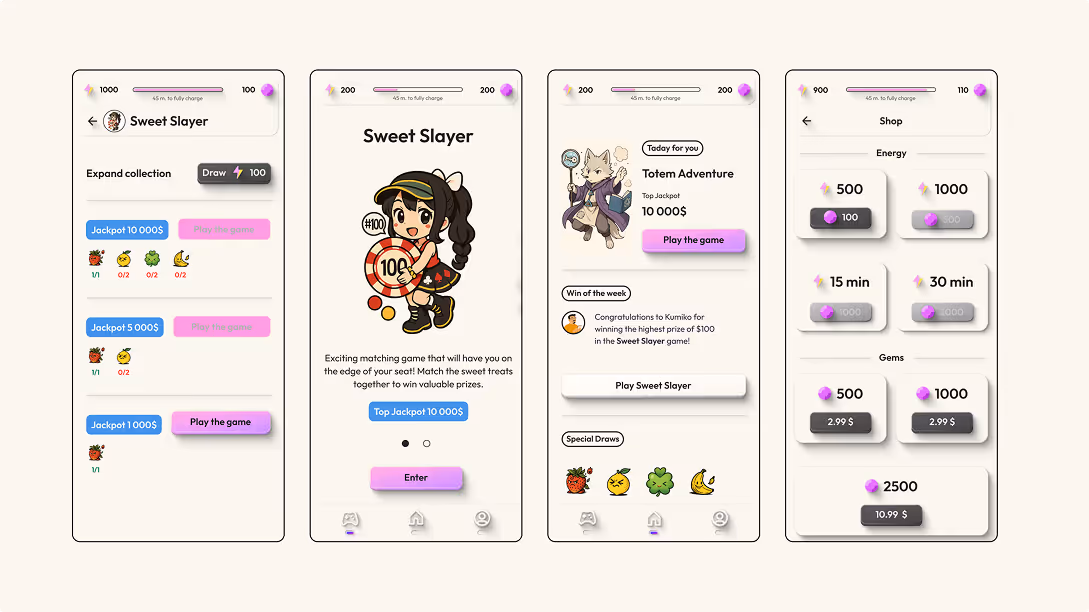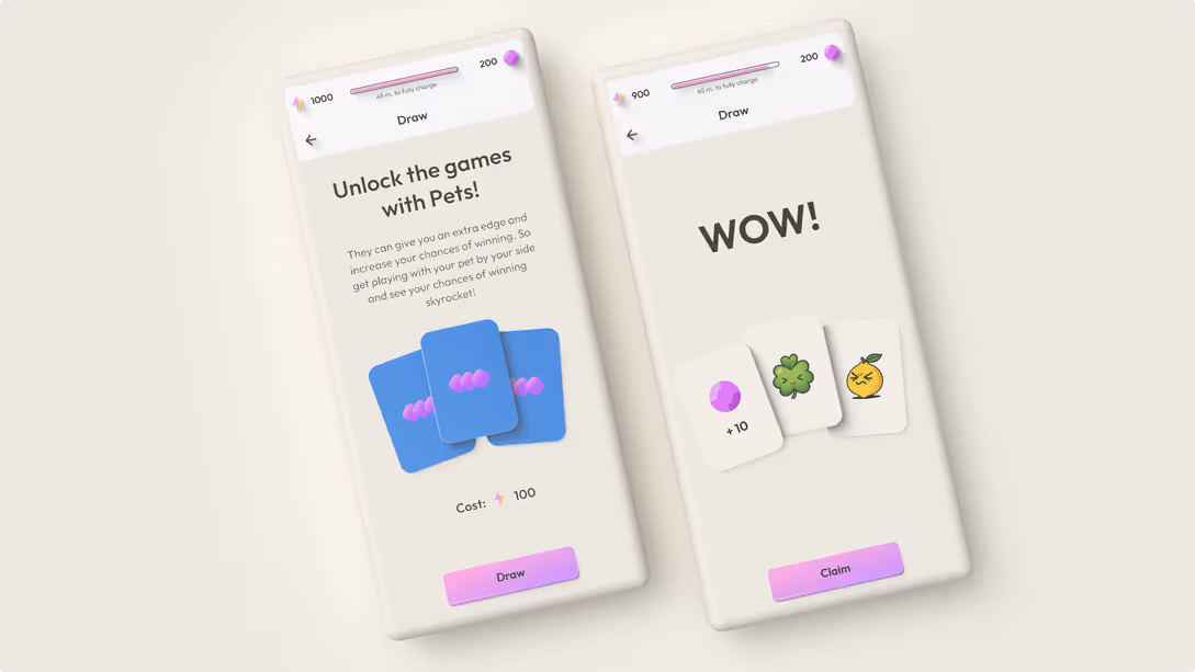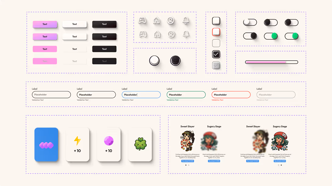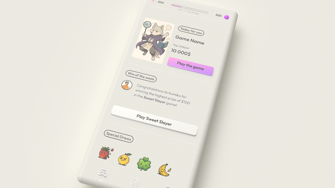 Design system obejmował całą bibliotekę elementów UI (przyciski, karty, awatary, lootboxy), wytyczne dotyczące kolorystyki, typografii, animacji oraz interakcji haptycznych i dźwiękowych. Dzięki temu zespół projektowy i deweloperski mógł pracować szybciej, a cała aplikacja zachowała spójny, rozpoznawalny charakter.